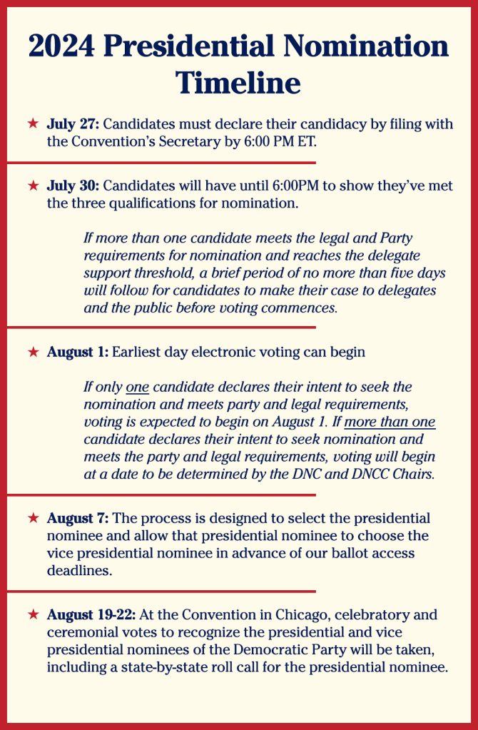 •  El presidente del DNCC y el presidente del DNC podrán abrir la votación sobre el candidato presidencial no antes del 1 de agosto de 2024.