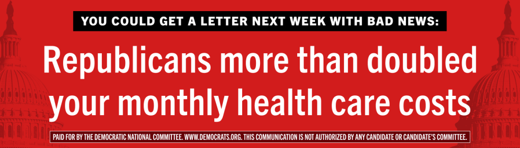 “Rigth after the holidays, health care costs for Americans across the country are going to more than double because Republicans are refusing to work with Democrats to fix this crisis. That’s why the DNC is going to make sure families everywhere know that Republicans are about to wreck their pocketbooks and price them out of health insurance. Through digital ads, billboards, bus shelter ads, and our state-of-the-art organizing team, we’re ensuring that Americans across the country know that Republicans are solely to blame for the biggest premium increases in history. We should all be asking: Why is it that Republicans can make billionaire tax breaks permanent but refuse to prevent health insurance costs for working families from doubling?”