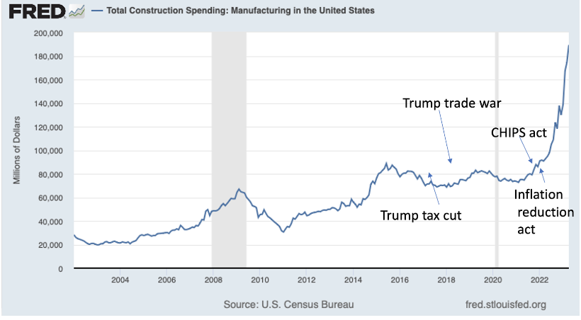 - The Trump tax cut of 2017, which was sold as a way of promoting U.S. investment, didn’t have any visible effect. Neither did the trade war, which kicked off in earnest in mid-2018. But under Biden, manufacturing construction, as some people put it, has gone parabolic, more than doubling just over the past year.