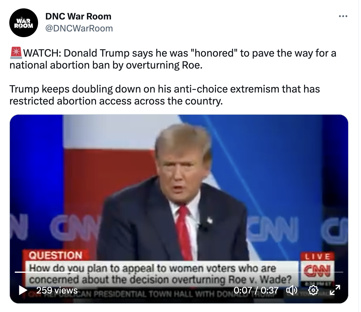 DONALD TRUMP:“Getting rid of Roe v. Wade was an incredible thing for pro-life because it gave pro-life something to negotiate with. Pro-life had absolutely nothing, being stuck in Roe v. Wade, to negotiate with. And now what’s happening, and I see it all over, deals are being made, deals are going to be made. And look, everybody that was president wanted to get rid and tried to get rid of Roe v. Wade … For fifty years, this has been going on. I was able to do it, and I was very honored to do it.”