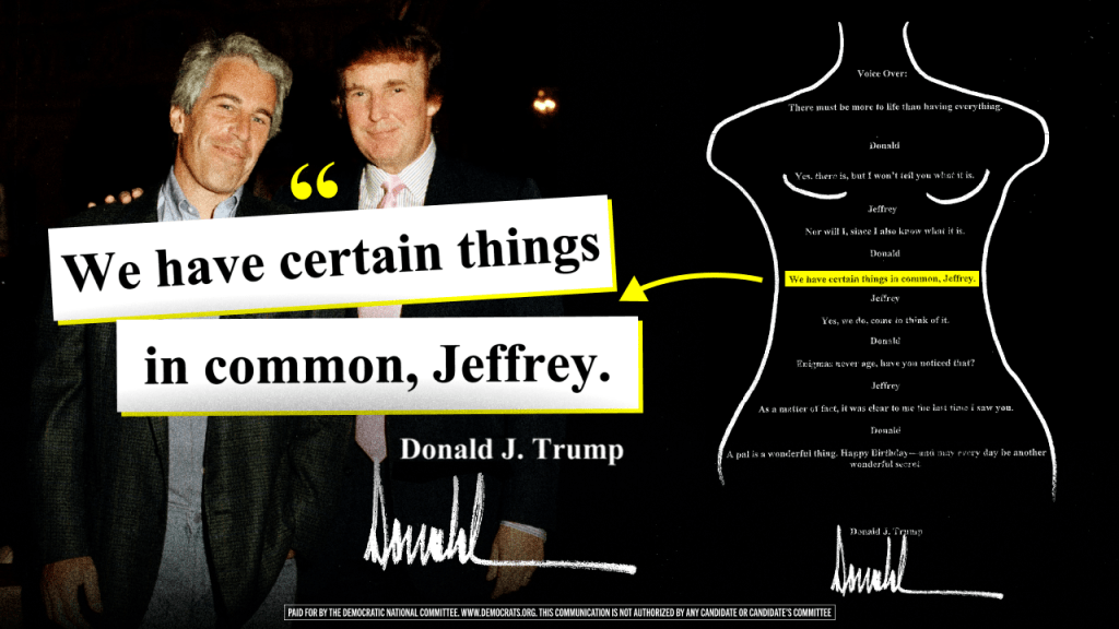 On Wednesday, the DNC deployed a mobile billboard to circle the White House and the Capitol displaying the lewd birthday card Donald Trump drew for convicted sex trafficker Jeffrey Epstein. In addition, the DNC also launched digital ads in several battleground districts. On Tuesday, Trump declined to answer questions about the letter calling it “a dead issue.”